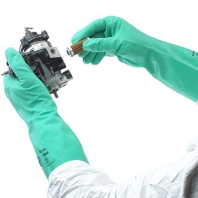 Guante de nitrilo verde de 13" de largo y 13 milésimas de espesor, con puño recto. El nitrilo en una de sus presentaciones mas usadas, ya que por las características de este modelo, con su grosor y diseño, permite alto rango de protección procesos mecánicos e industrias químicas, se recomienda para el manejo de solventes, aceites, pinturas y barnices, el relieve de la palma ofrece mayor adherencia en procesos resbaladizos o con presencia de líquidos. Aceptado por FDA para la manipulación de alimentos.